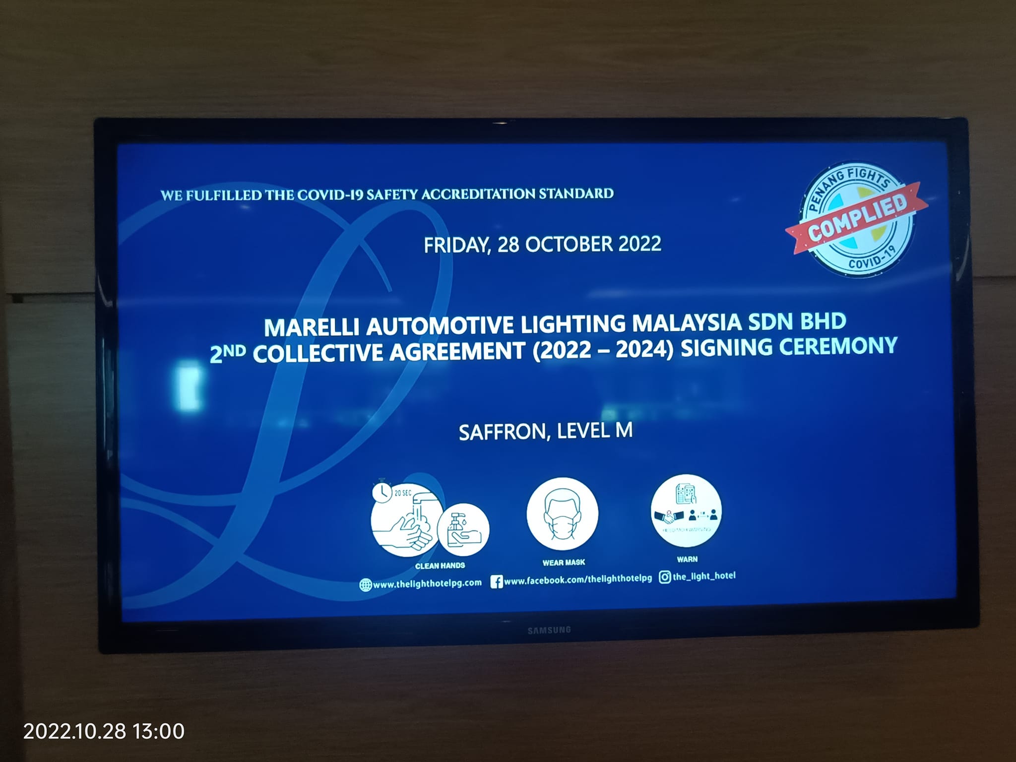 On that day, Marelli Automotive Lighting Malaysia and NUTEAIW witnessed a significant event by signing the 2nd Collective Agreement, illuminating their successful collaboration. The Light Hotel Penang provided an elegant backdrop for the ceremony, adding a touch of prestige to the signing of the collective agreement. The 2nd Collective Agreement is a continuation of the successful partnership between Marelli Automotive Lighting Malaysia and NUTEAIW. The significant event took place on October 28, 2022, at The Light Hotel Penang.